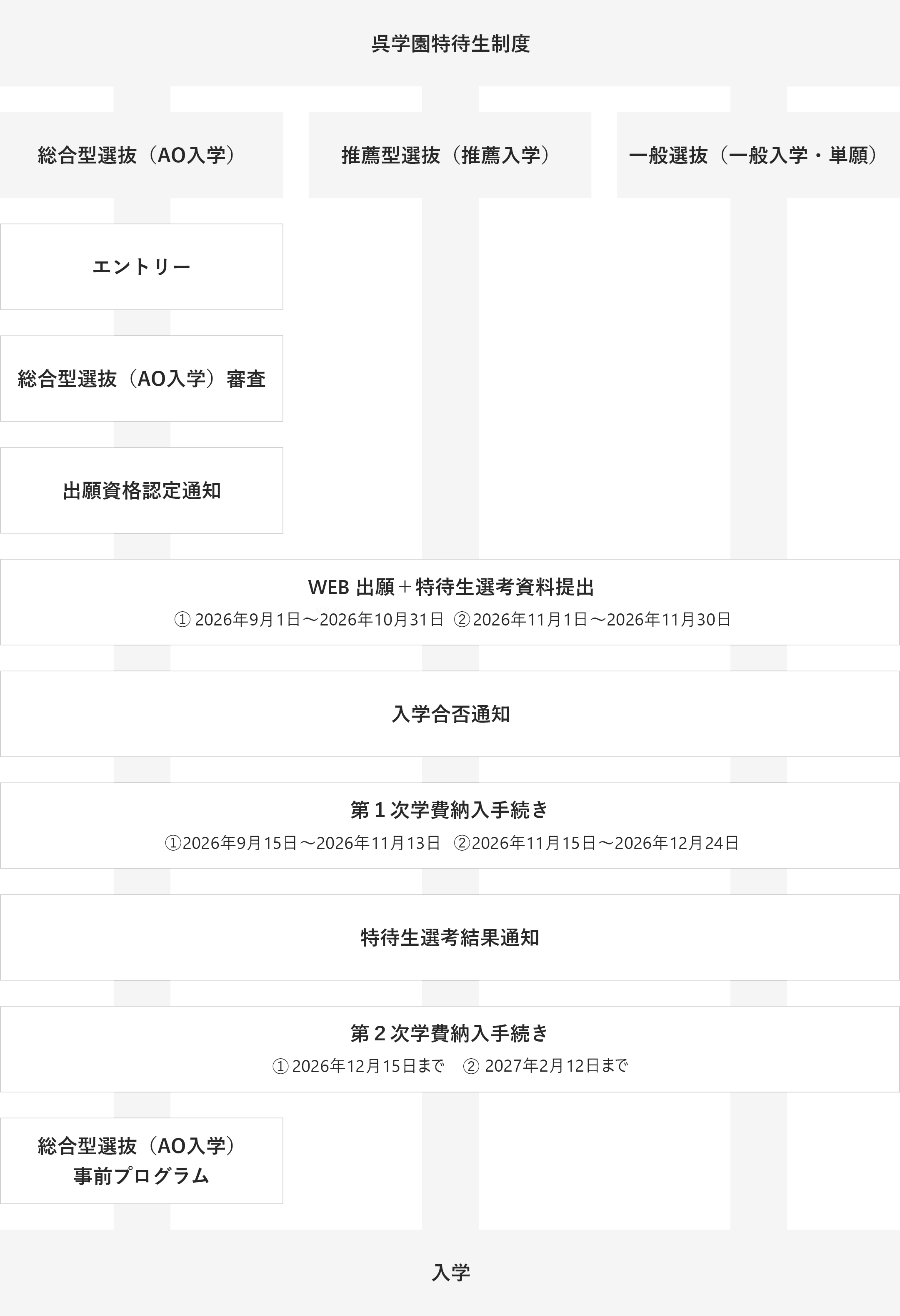 | 注意事項 | ※総合型選抜(AO入学)で、①特待生A・B・Cを希望される方は、第1回目までにエントリーしてください。②特待生B・Cを希望される方は、第2回の2026年11月10日までにエントリーしてください。詳細は募集要項のP05をご覧ください。 ※他の特待生制度に選ばれた場合、奨励金額の高い方を優先します。 ※呉学園特待生希望者は学費納入方法が通常と異なります。第1次学費(入学金)の納入後、審査を実施いたします。審査結果により奨励金額を減免後、第2次学費納入を行います。 |