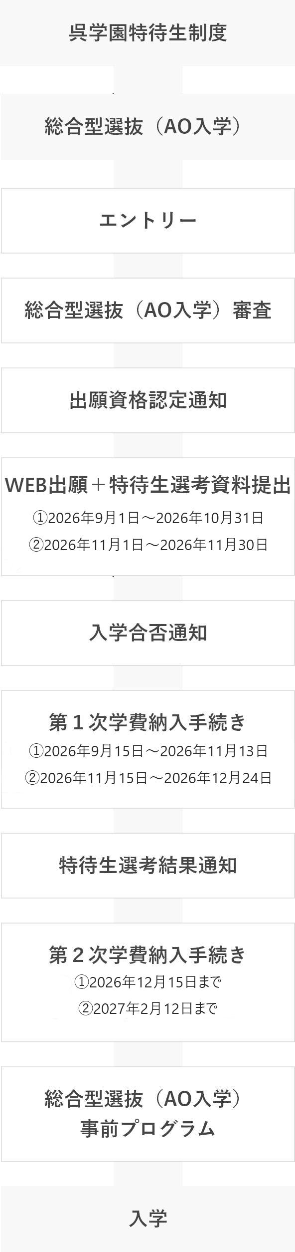 | 注意事項 | ※総合型選抜(AO入学)で、①特待生A・B・Cを希望される方は、第1回目までにエントリーしてください。②特待生B・Cを希望される方は、第2回の2026年11月10日までにエントリーしてください。詳細は募集要項のP05をご覧ください。 ※他の特待生制度に選ばれた場合、奨励金額の高い方を優先します。 ※呉学園特待生希望者は学費納入方法が通常と異なります。第1次学費(入学金)の納入後、審査を実施いたします。審査結果により奨励金額を減免後、第2次学費納入を行います。 |